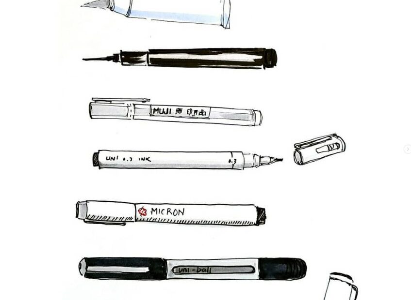 - Un bolígraf de tinta resistent a l’aigua: Aquest és clau si després vols afegir aquarel·la. D’aquesta manera la línia negra no s’esborra. Hi ha marques fantàstiques com Faber-Castell, Pigma Micron, o UniBall.