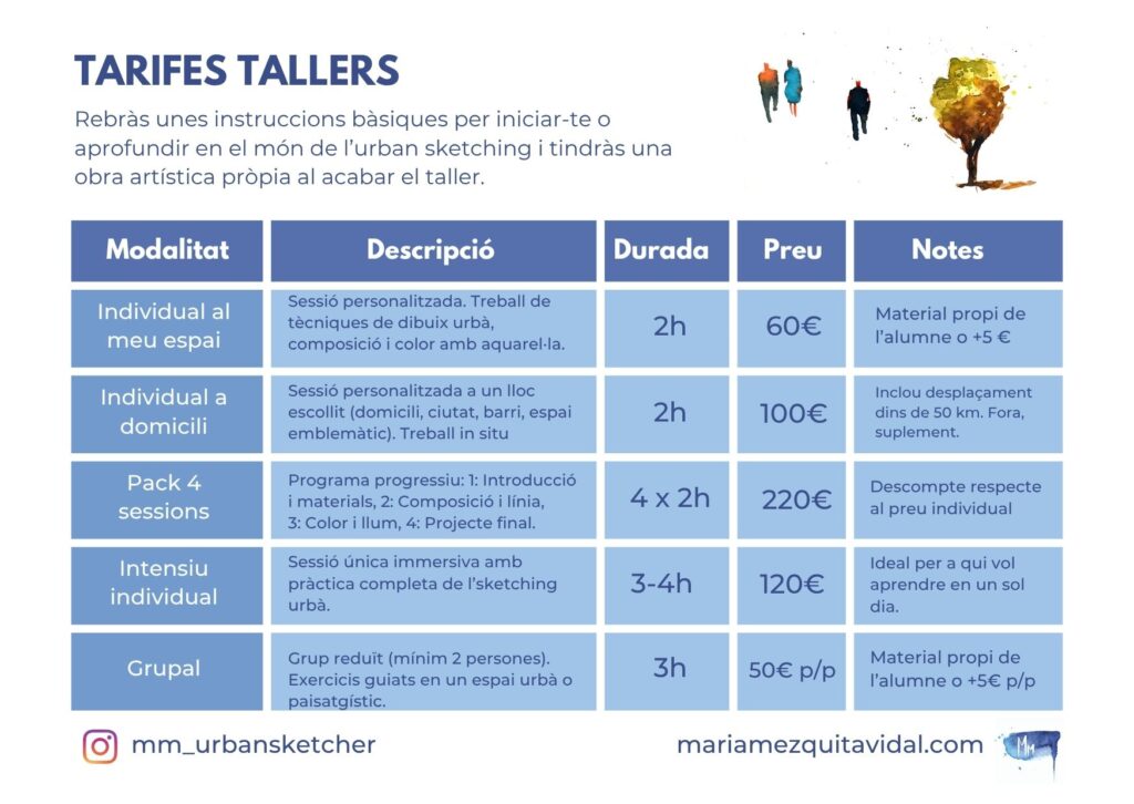Mira la taula de tarifes generals de tallers però si cal adaptar alguna coseta en podem parlar per posar-nos d’acord 😉